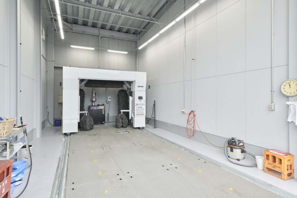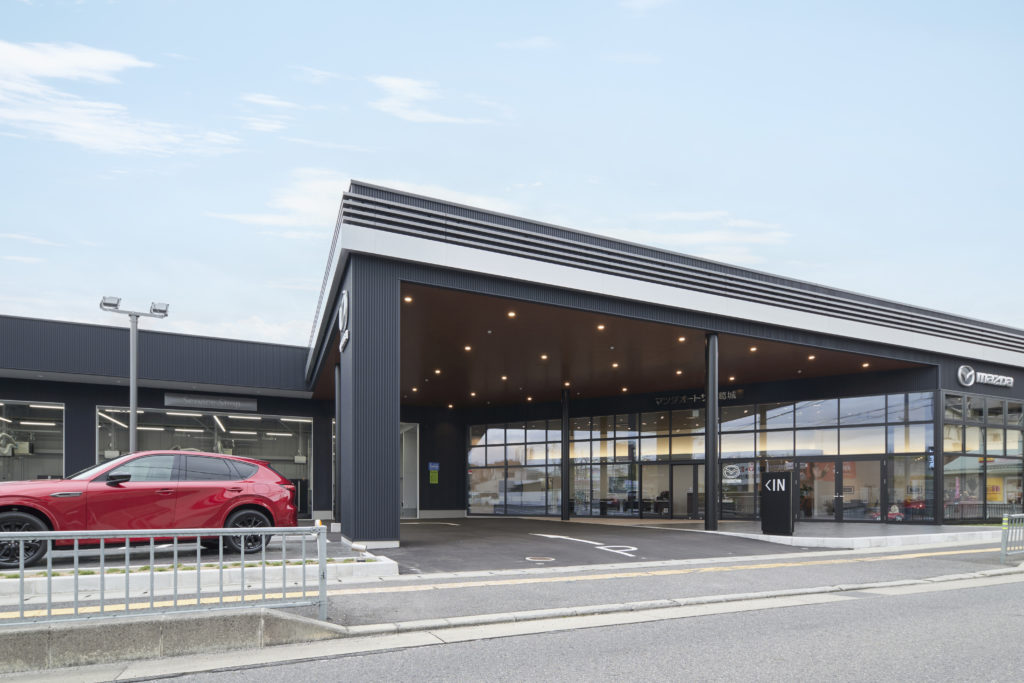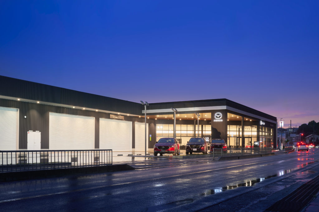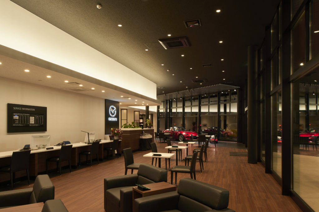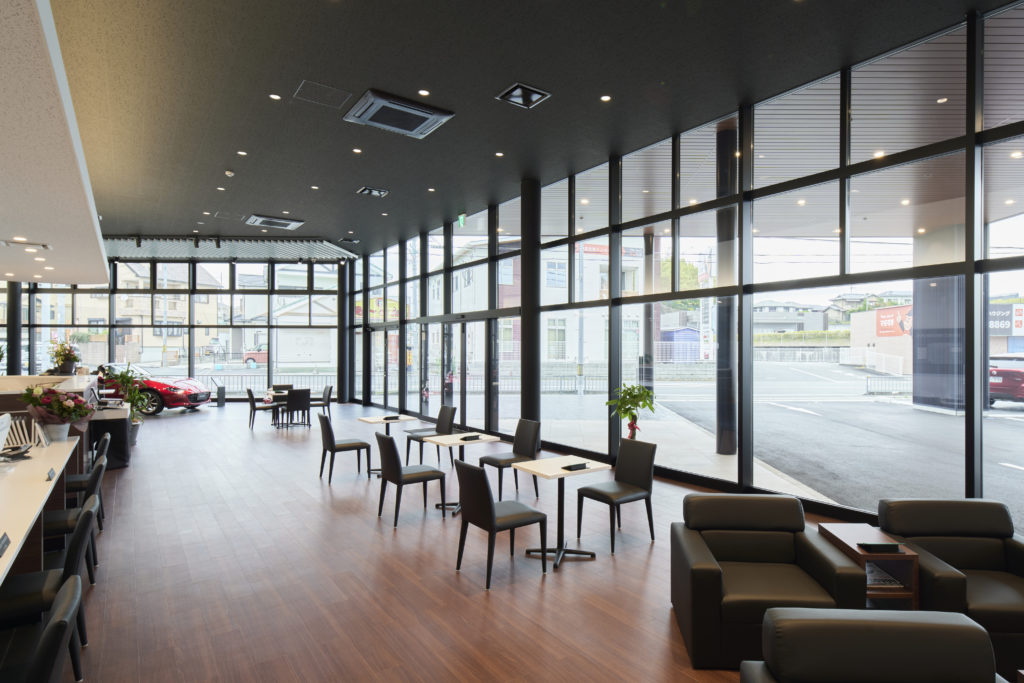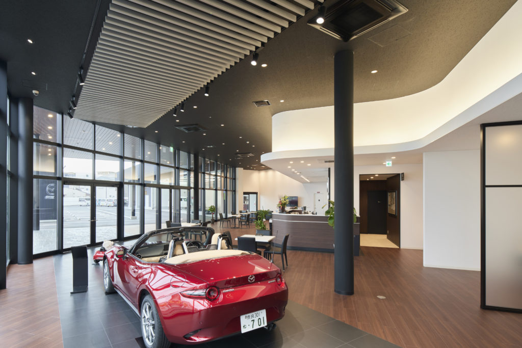 カーディーラーの県内初、高級路線の「新世代店舗」として移転新築の計画。車社会である奈良県の国道沿いに計画する建物として、上り下りの両側から受け入れるようなファサードを作り、カーテンウォールから屋外展示まで一本に続く「花道」が疾走感を演出し、購買意欲に刺激を与える平面計画としている。